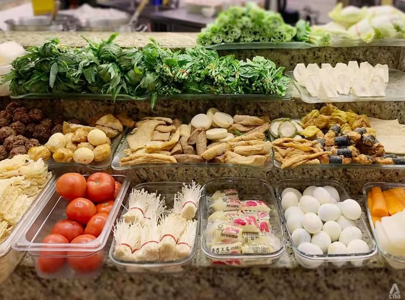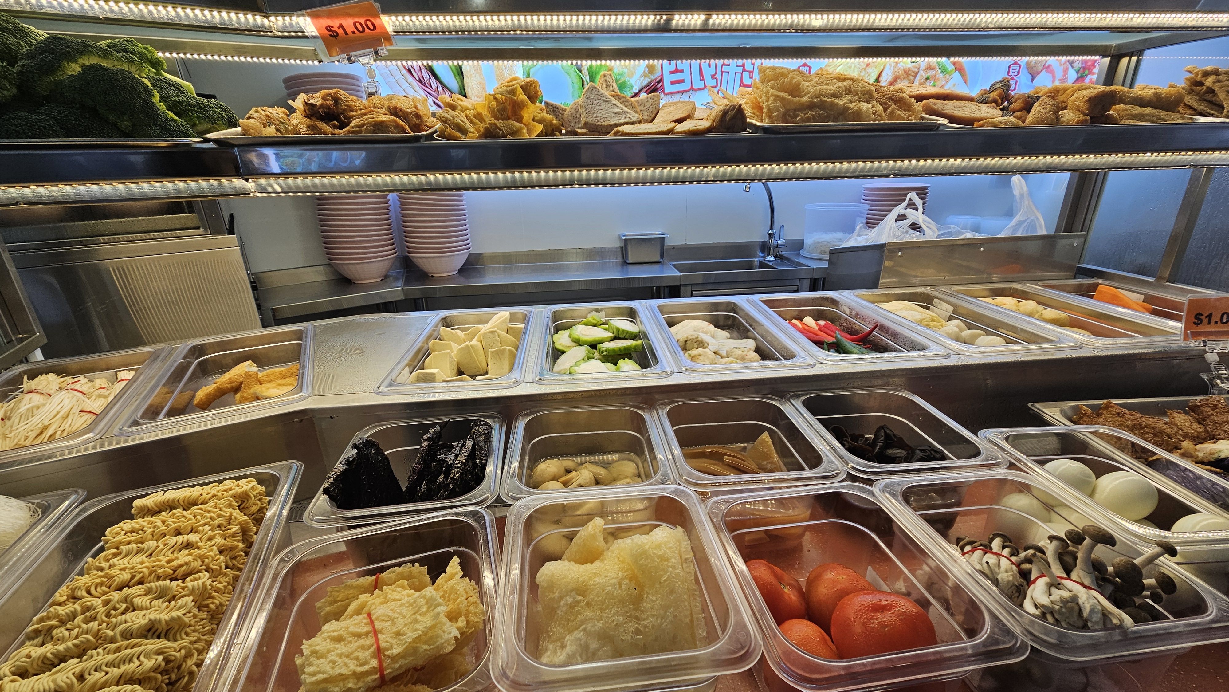 1. (빈 그릇 하나와 집게를 들고) 진열된 재료들 가운데 마음에 드는 것을 집어 담습니다. (두부, 어묵, 채소, 심지어 국수까지!)