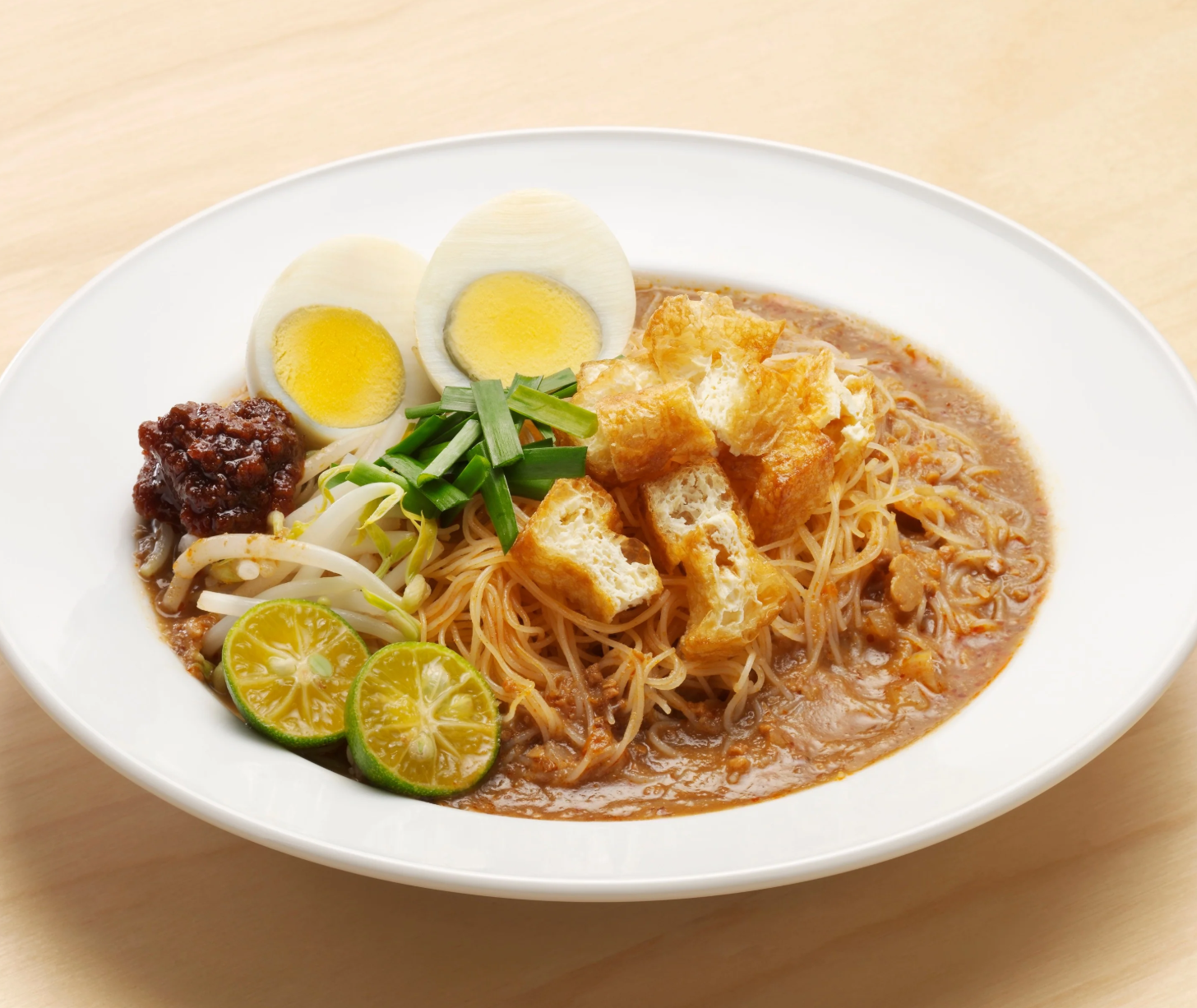 한 그릇의 미시암은 토핑이 풍성하게 얹혀 나옵니다. 삶은 달걀, 새우, 두부 튀김, 숙주, 부침 두부, 차이포(절인 무 절임) 등이 대표적이며, 취향에 따라 라임즙을 곁들이면 더욱 산뜻한 맛을 즐길 수 있습니다.
